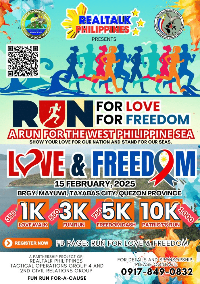 Join Realtalk Philippines, in partnership with Tactical Operations Group 4 of the Philippine Air Force and 2CRG-CRSAFP, for the “Run for Love, Run for Freedom” on February 15, 2025, in Brgy. Mayuwi, Tayabas City, Quezon Province. This special event celebrates love, freedom, and the advocacy for the West Philippine Sea.