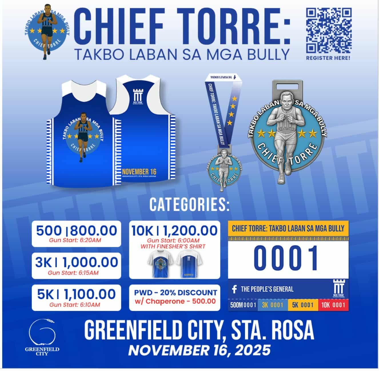 The Chief Torre: Takbo Laban sa mga Bully fun run is happening on November 16, 2025, at Paseo de Sta. Rosa, Greenfield City, Sta. Rosa, Laguna. Organized by PG1 Event Management Services, this meaningful run is more than just a race — it’s a movement against bullying and a call for kindness and courage within our communities.