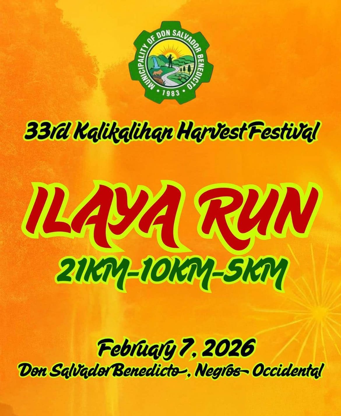 Are you ready to conquer the roads of Don Salvador Benedicto? As we celebrate Don Salvador Benedicto’s 43rd Founding Anniversary and 33rd Kalikalihan Harvest Festival, join us and be part of the ILAYA RUN.