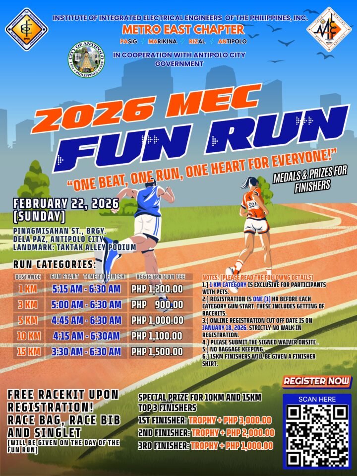 The 2026 MEC Fun Run is gearing up to unite runners, families, and pet lovers on February 22, 2026, brought to life by the Institute of Integrated Electrical Engineers of the Philippines – Metro East Chapter. Set in Pinagmisahan St., Brgy. Dela Paz, Antipolo City, this event embraces the inspiring theme “One Beat, One Run, One Heart for Everyone!”